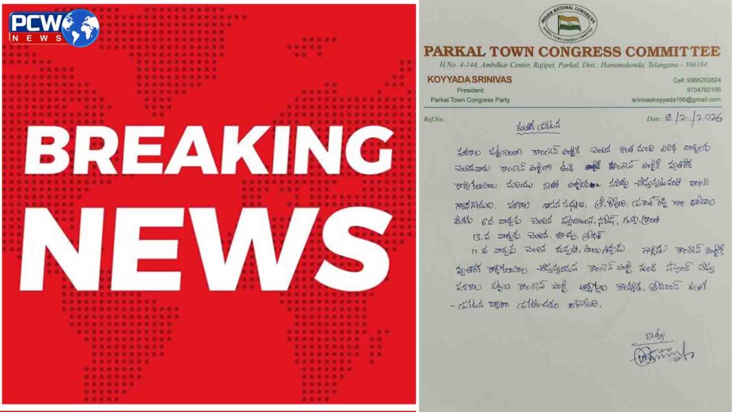పరకాల, ఫిబ్రవరి 8 (పిసిడబ్ల్యూ న్యూస్): పరకాల పట్టణంలో కాంగ్రెస్ పార్టీ క్రమశిక్షణకు విరుద్ధంగా వ్యవహరిస్తూ, పార్టీ సభ్యులుగా కొనసాగుతూనే పార్టీకి వ్యతిరేక కార్యకలాపాలు నిర్వహిస్తూ ఇతర రాజకీయ పార్టీలకు మద్దతు ఇస్తున్న వారిపై కఠిన చర్యలు తీసుకున్నట్లు పరకాల పట్టణ కాంగ్రెస్ పార్టీ అధ్యక్షులు కొయ్యడ శ్రీనివాస్ ఒక పత్రిక ప్రకటనలో తెలిపారు. ఆదివారం పరకాల శాసనసభ్యులు రేవూరి ప్రకాష్ రెడ్డి ఆదేశాల మేరకు, పార్టీ ప్రతిష్ఠకు భంగం కలిగించే విధంగా వ్యవహరించిన కొంతమందిని కాంగ్రెస్ పార్టీ నుండి సస్పెండ్ చేస్తున్నట్లు ఆయన వెల్లడించారు. 6వ వార్డుకు చెందిన పల్లె బోయిన నరేష్, గువ్వా క్రాంతి, 13వ వార్డుకు చెందిన బొచ్చు శ్రీధర్, 11వ వార్డుకు చెందిన దుప్పటి సాంబశివుడు పార్టీ శ్రేణుల్లో ఉండి కూడా కాంగ్రెస్ పార్టీకి వ్యతిరేకంగా పనిచేస్తూ ఇతర పార్టీలకు బహిరంగంగా సహకరిస్తున్నారని ఆరోపించారు. కాంగ్రెస్ పార్టీ సిద్ధాంతాలు, నాయకత్వం, నిర్ణయాలకు కట్టుబడి పనిచేయాల్సిన బాధ్యత ప్రతి కార్యకర్తపై ఉందని, పార్టీ క్రమశిక్షణను అతిక్రమించే వారిని ఎంతటి వారైనా ఉపేక్షించేది లేదని ఆయన స్పష్టం చేశారు. పార్టీ వ్యతిరేక కార్యకలాపాలకు పాల్పడితే భవిష్యత్తులో కూడా ఇలాంటి కఠిన చర్యలు తప్పవని హెచ్చరించారు. పరకాల పట్టణంలో కాంగ్రెస్ పార్టీని మరింత బలోపేతం చేయడమే లక్ష్యంగా, నిజాయితీగా పనిచేసే కార్యకర్తలతో ముందుకు సాగుతామని, పార్టీపై నిబద్ధత లేని వారిపై కఠినంగా వ్యవహరిస్తామని కొయ్యడ శ్రీనివాస్ తెలిపారు.
